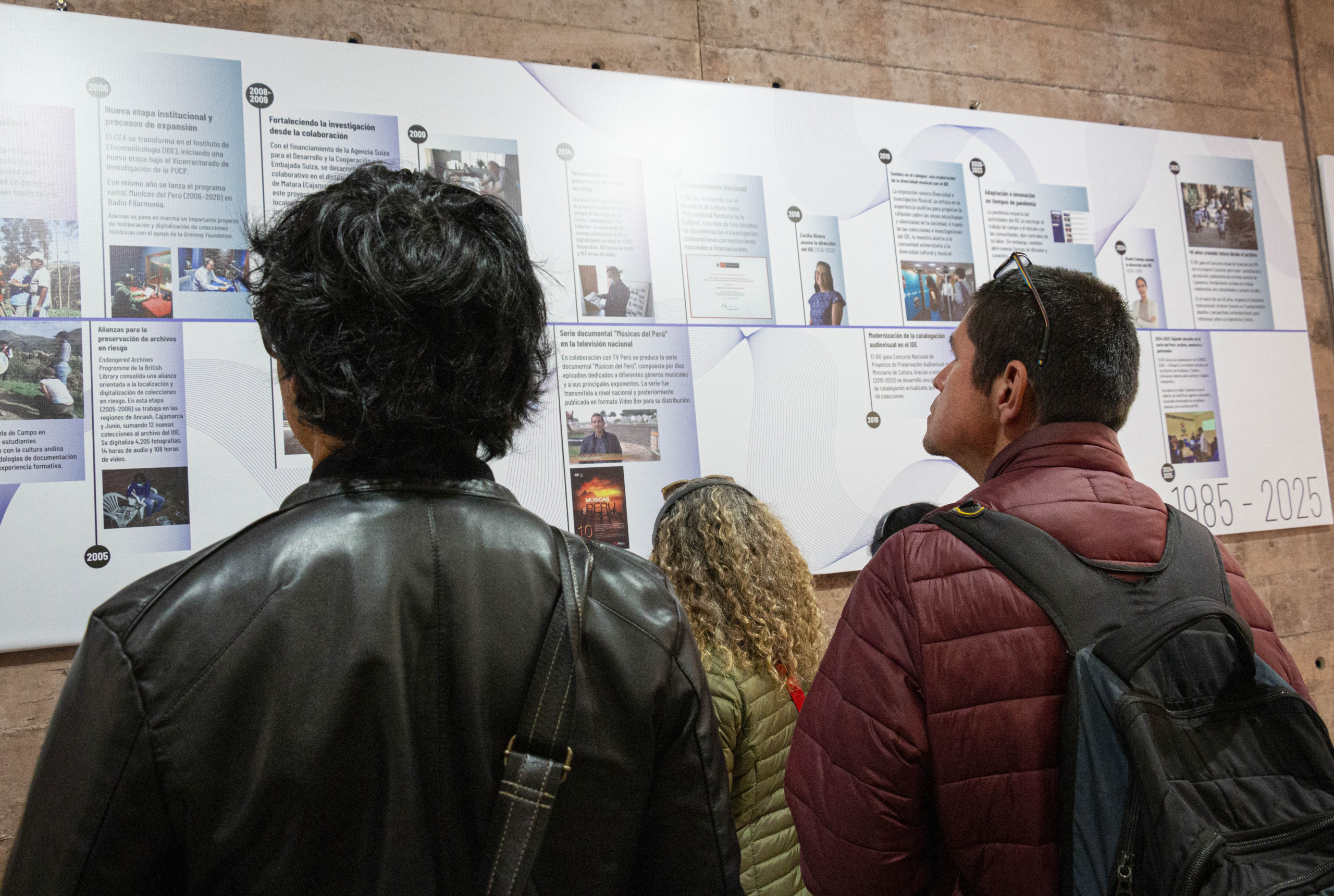 Organizada en cinco módulos temáticos, la exposición presenta los ejes centrales de la trayectoria del Instituto: la formación del archivo y sus colecciones, su gestión como archivo universitario, la circulación de sus materiales y su reconexión con las comunidades, junto con los proyectos de cooperación institucional. Una línea de tiempo destaca los hitos más relevantes de estos 40 años, mientras que tres tablets interactivas permiten escuchar ejemplos sonoros registrados en diversas regiones, generando una experiencia de escucha inmersiva que conecta al público con los paisajes musicales del Perú.